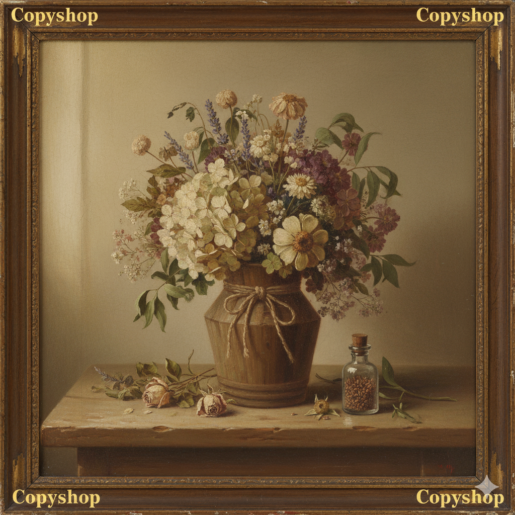 Bức tranh vintage hoa khô là biểu tượng của vẻ đẹp vĩnh cửu – nơi thời gian dừng lại trên từng cánh hoa đã qua mùa rực rỡ, nhưng vẫn giữ được hương sắc và tinh thần của sự sống.
